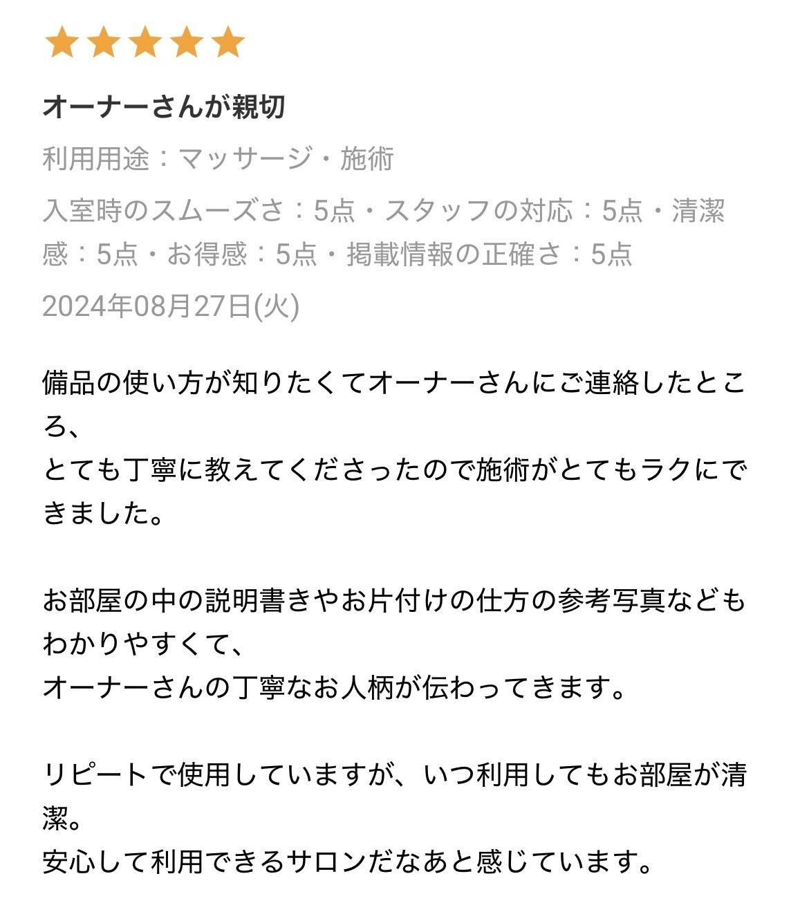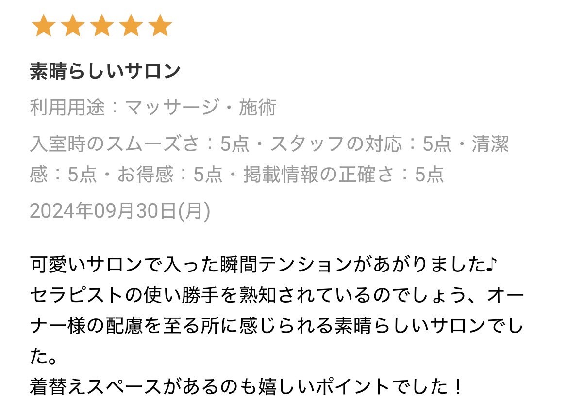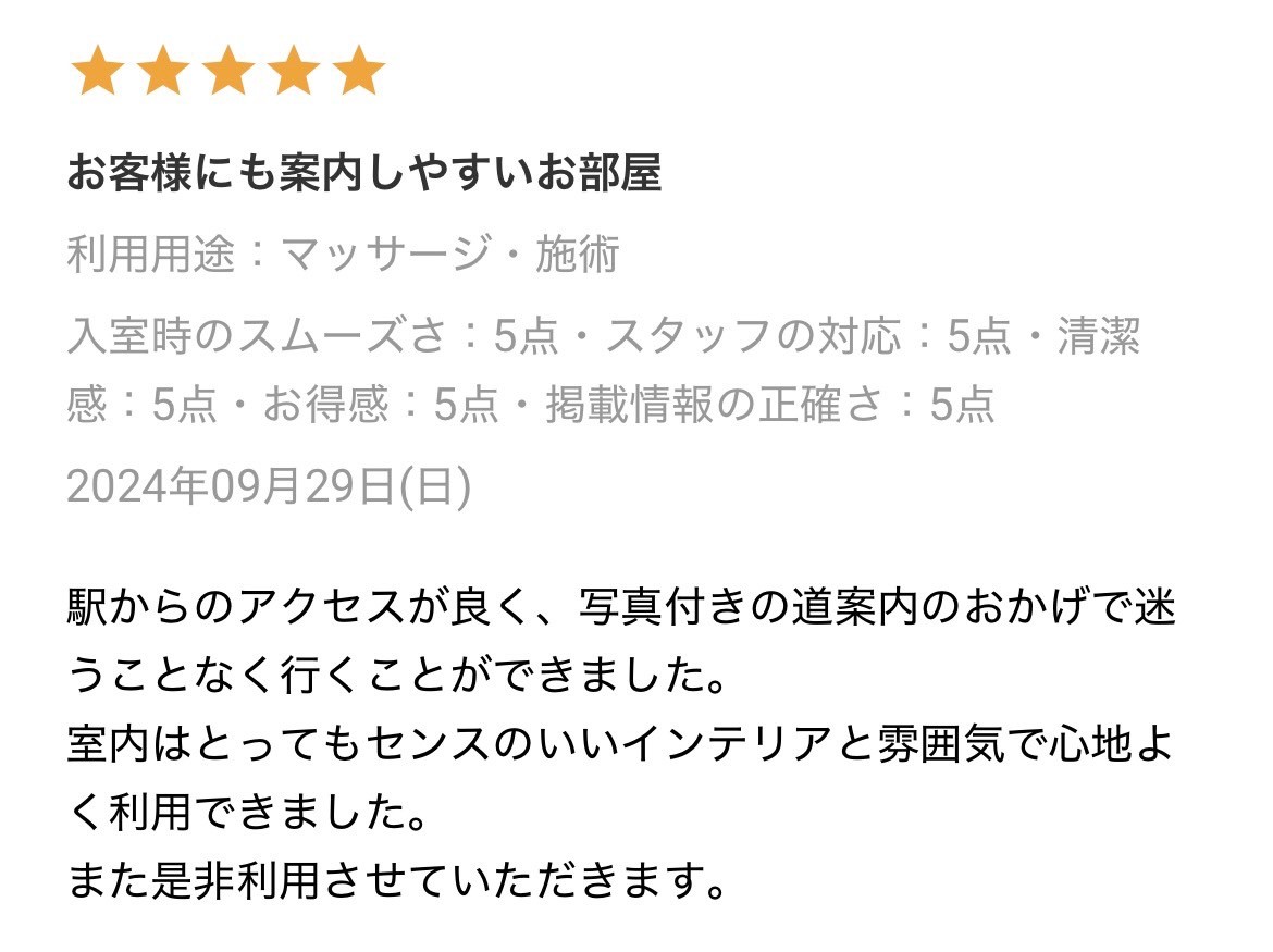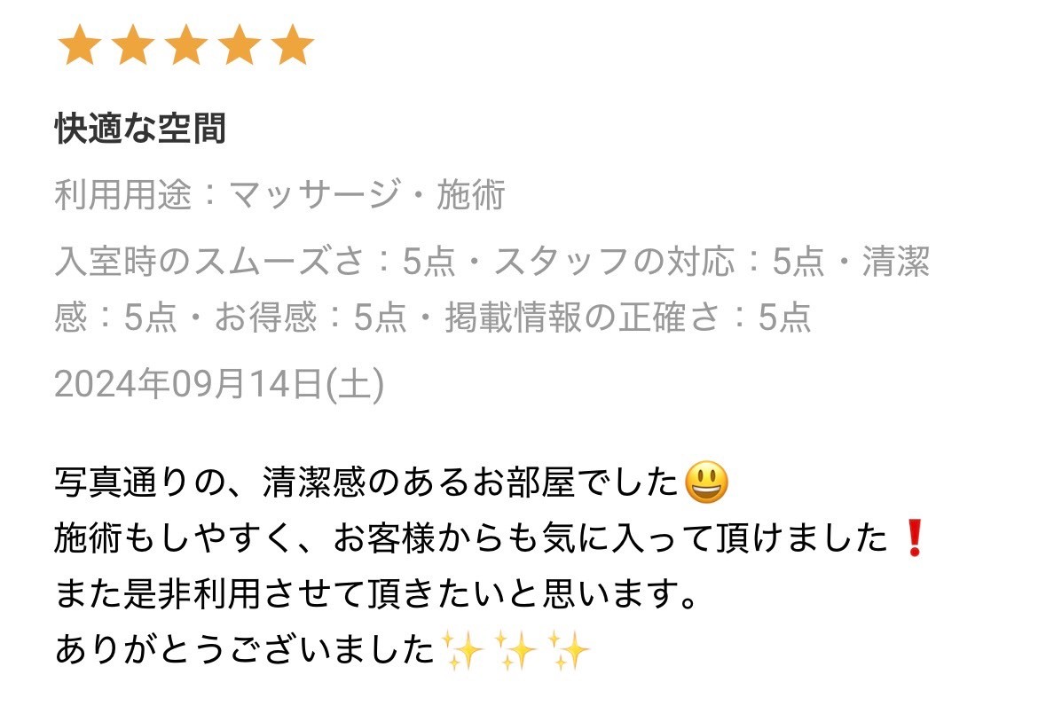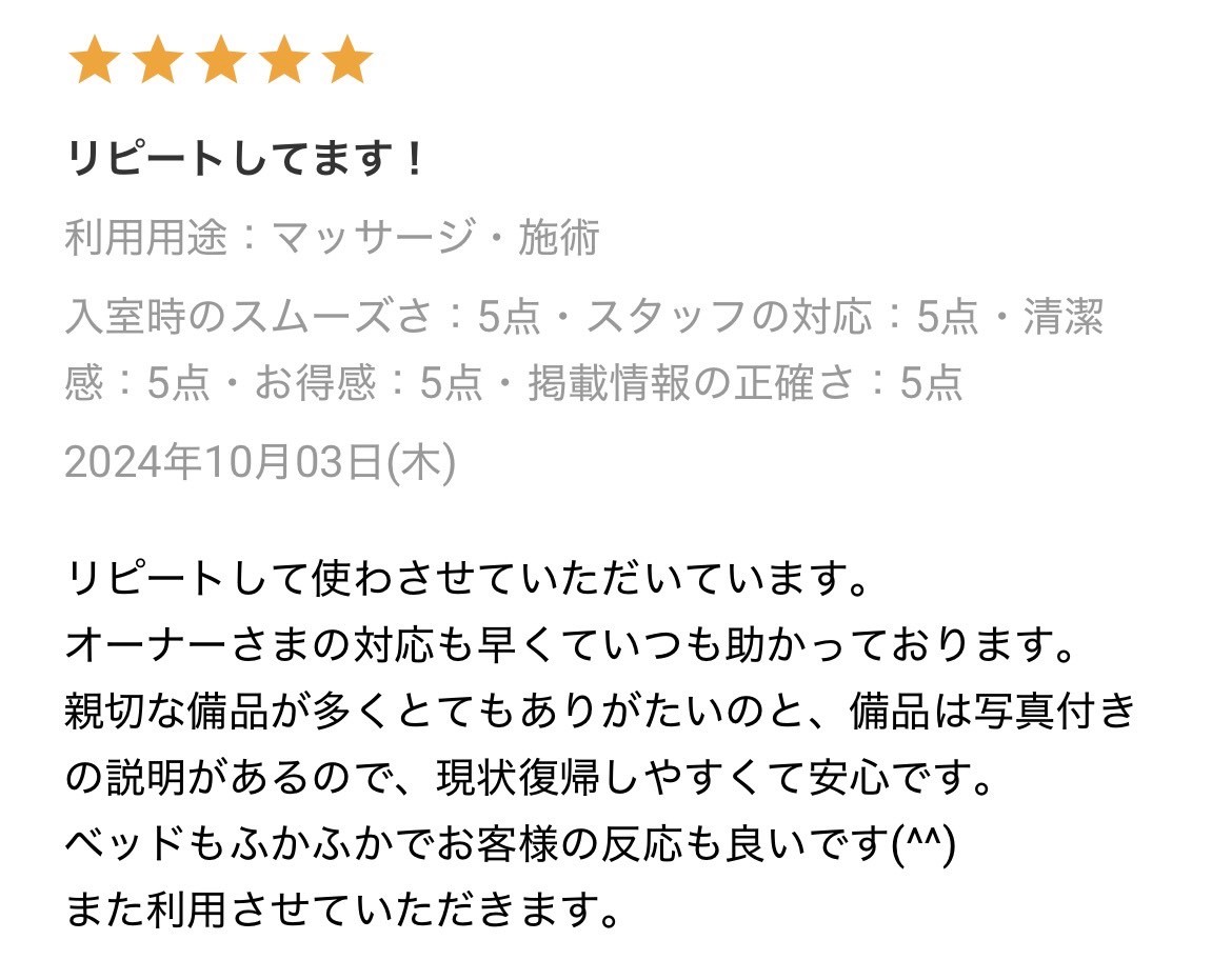 他のお客様とバッティングしてしまう可能性があるため、予約時間外のご利用はご遠慮ください。施術の準備や清掃も予約時間内でお願いします。